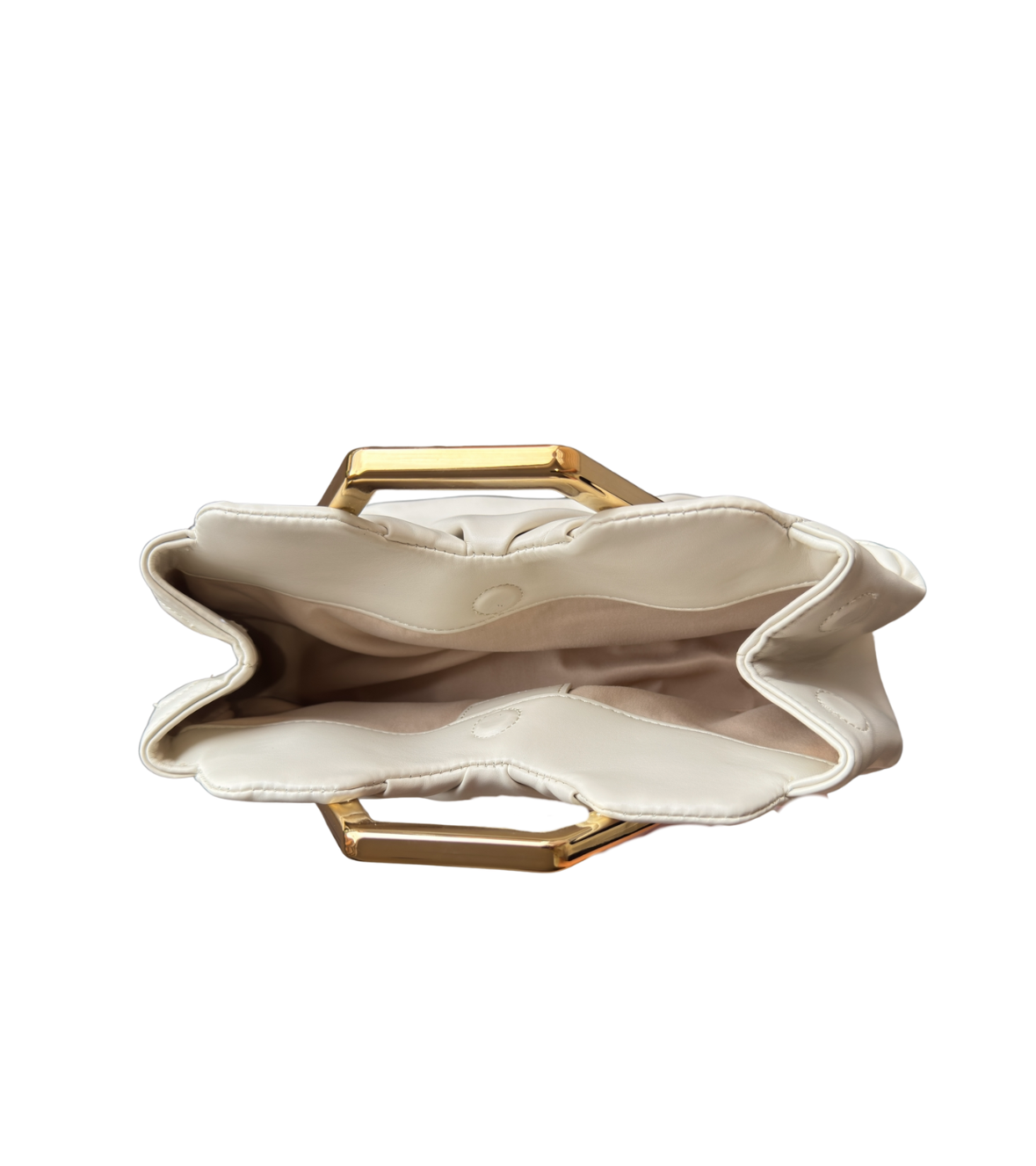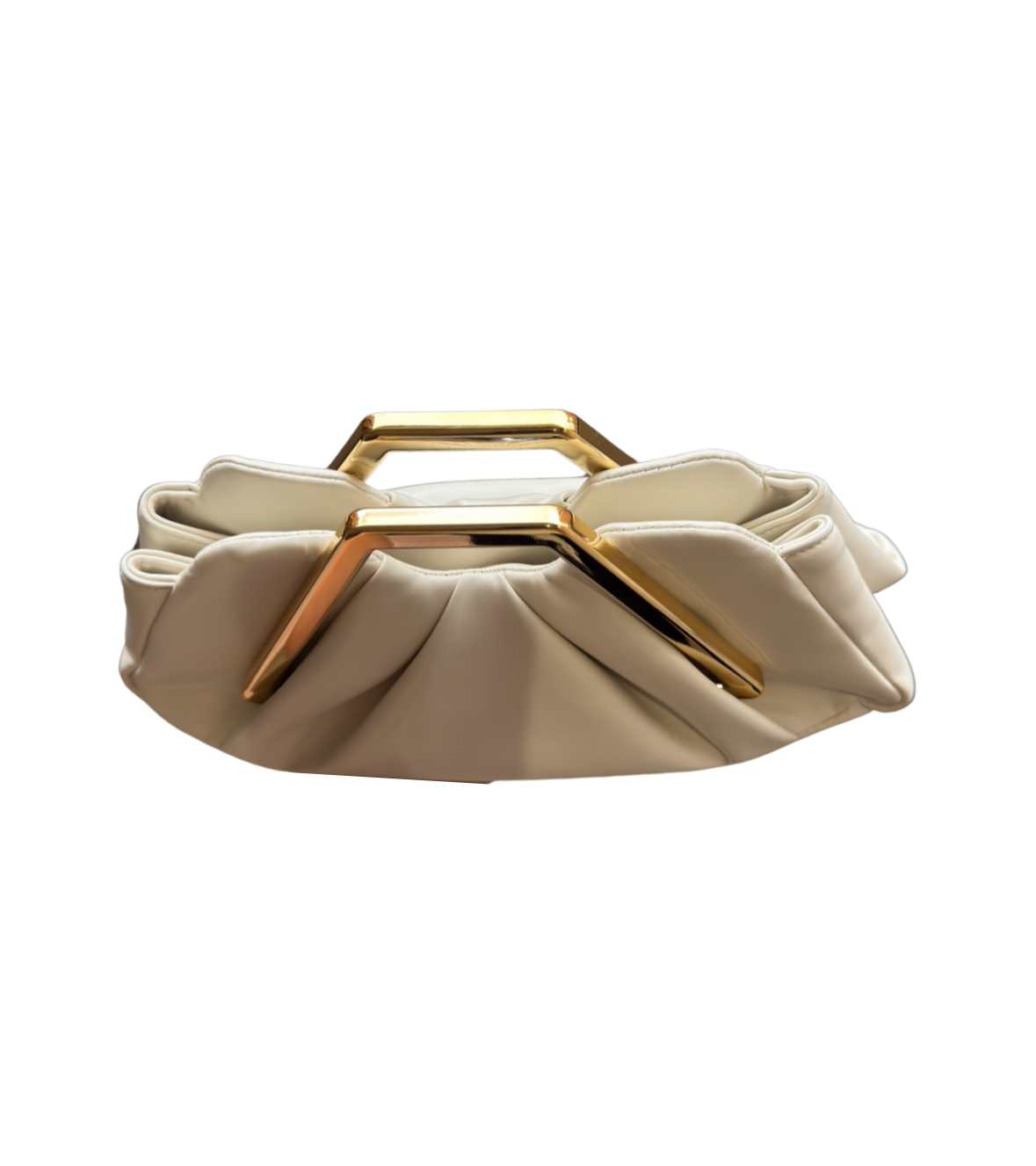 El elemento protagonista es su asa metálica geométrica en acabado dorado, una pieza rígida que funciona como detalle de lujo y sello distintivo del diseño. Su forma angular crea un contraste moderno con la textura fluida del cuerpo del bolso, generando un equilibrio perfecto entre minimalismo y opulencia.